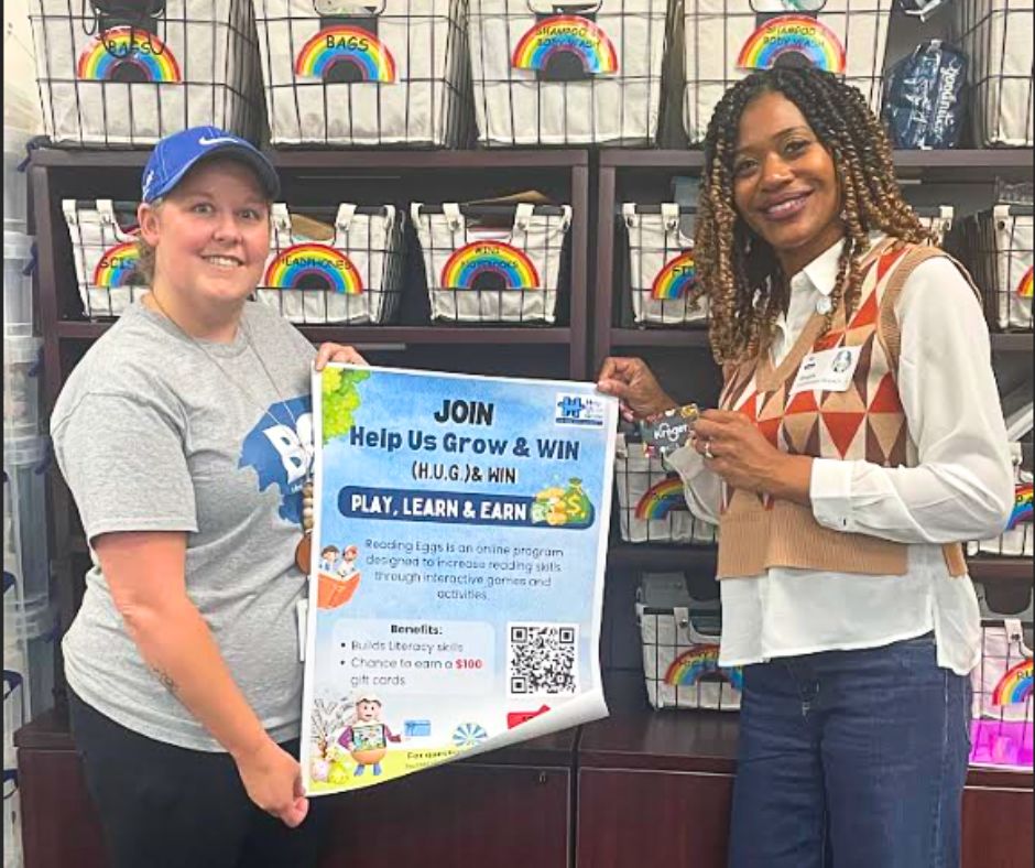 Our KY Director, Shayla Branch, had the joy of visiting with Stephanie Volpert, Family Resource Coordinator, to present our H.U.G. & WIN poster along with Kroger gift cards for student game winners.