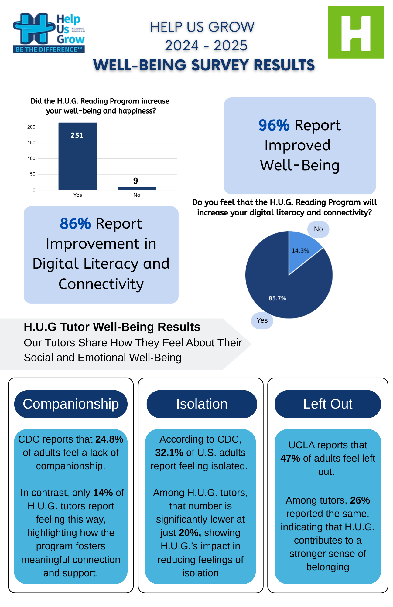 The H.U.G. Reading Program doesn’t just transform literacy outcomes — it also strengthens the well-being of our mentors. Our 2024–2025 Well-Being Survey revealed powerful results: -