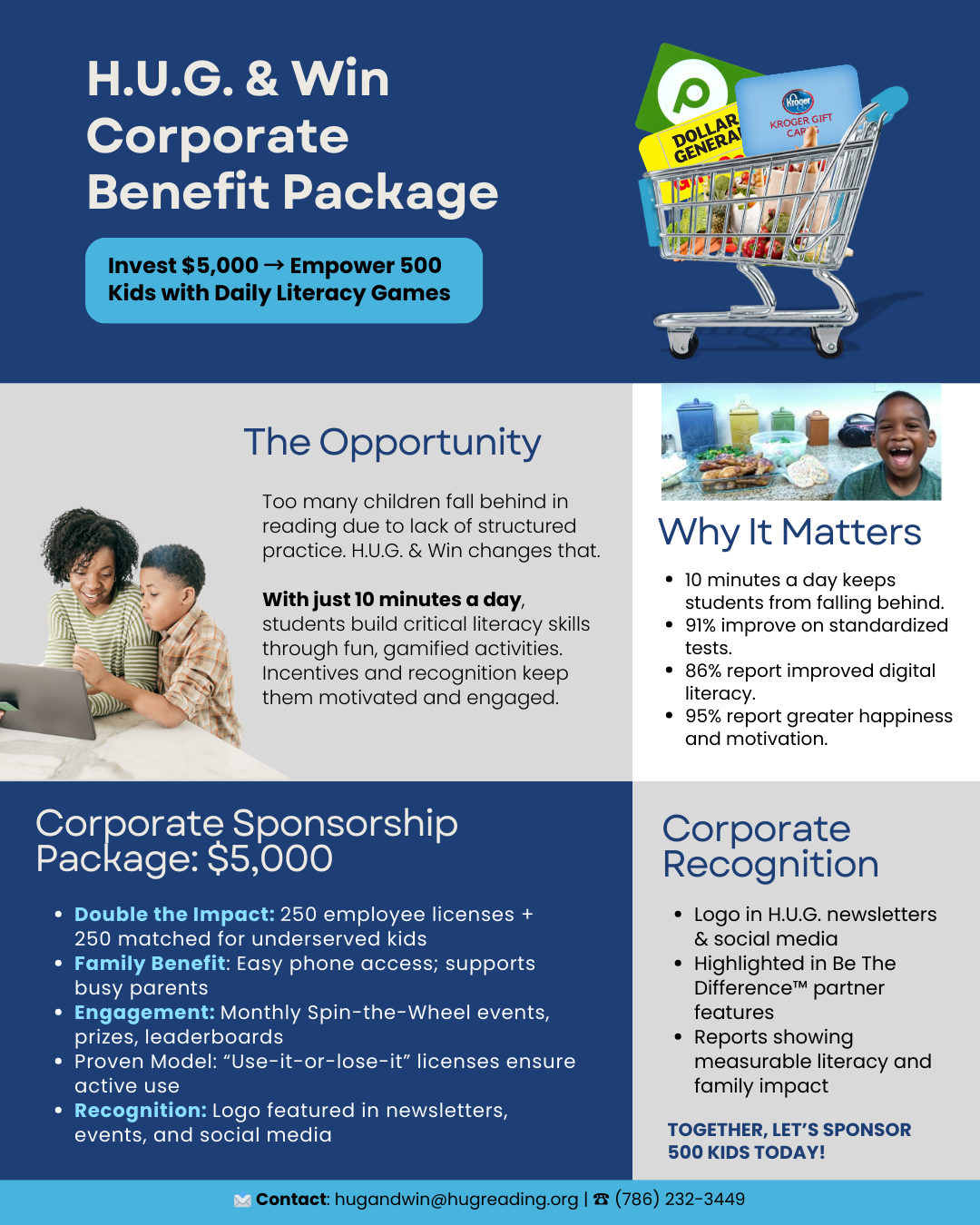 Through the H.U.G. & Win Corporate Benefit Package, businesses have the opportunity to empower children while engaging their own teams. With an investment of $5,000, companies can: -