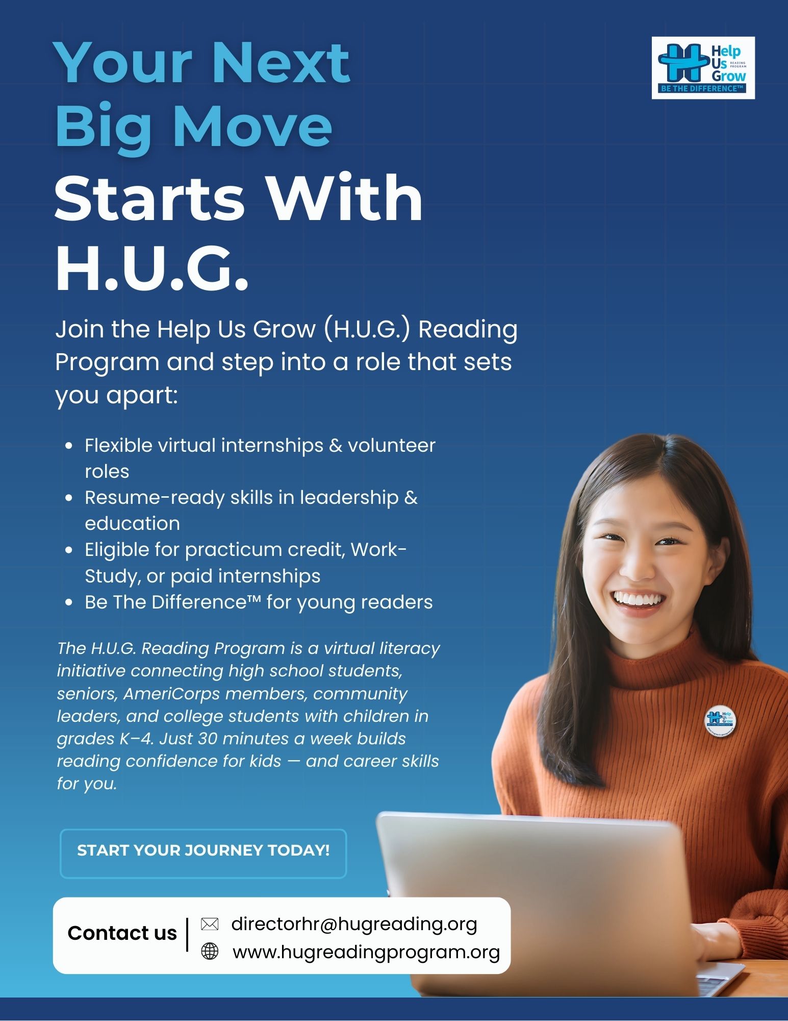 Looking for a meaningful way to grow your skills while making a difference? The Help Us Grow (H.U.G.) Reading Program offers flexible virtual internships and volunteer roles that empower you to build your resume and your community at the same time.