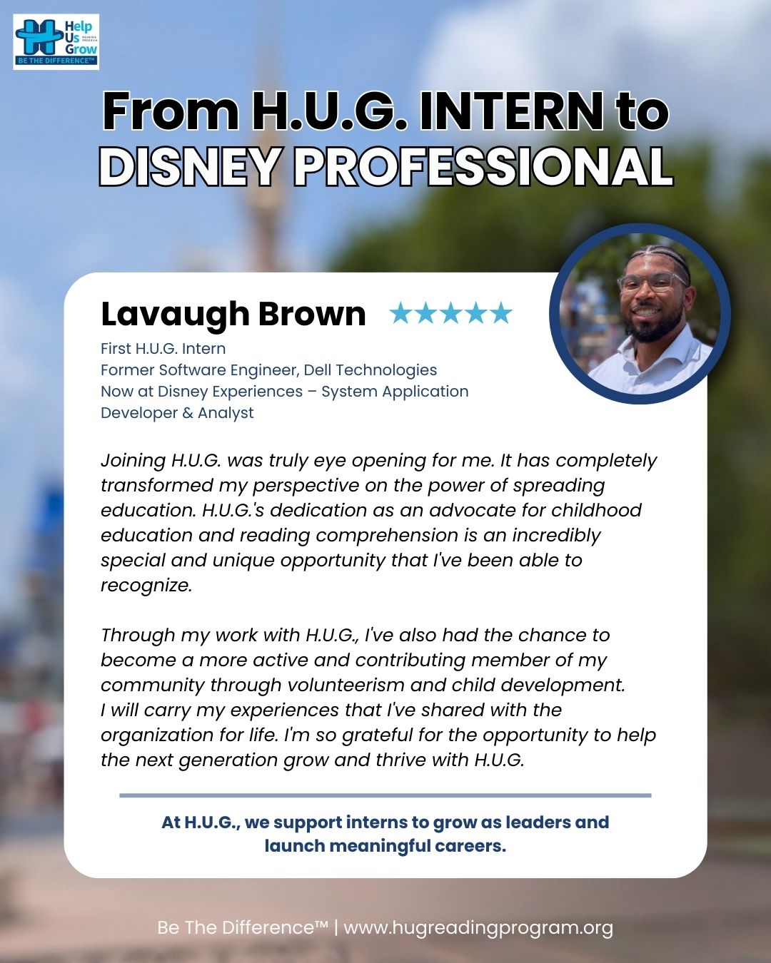 Those early steps helped shape the professional he is today — now thriving as a System Application Developer & Analyst at Disney Experiences. His story is a reminder that H.U.G. internships aren’t just about giving back — they’re also about building skills, growing as leaders, and launching meaningful careers.